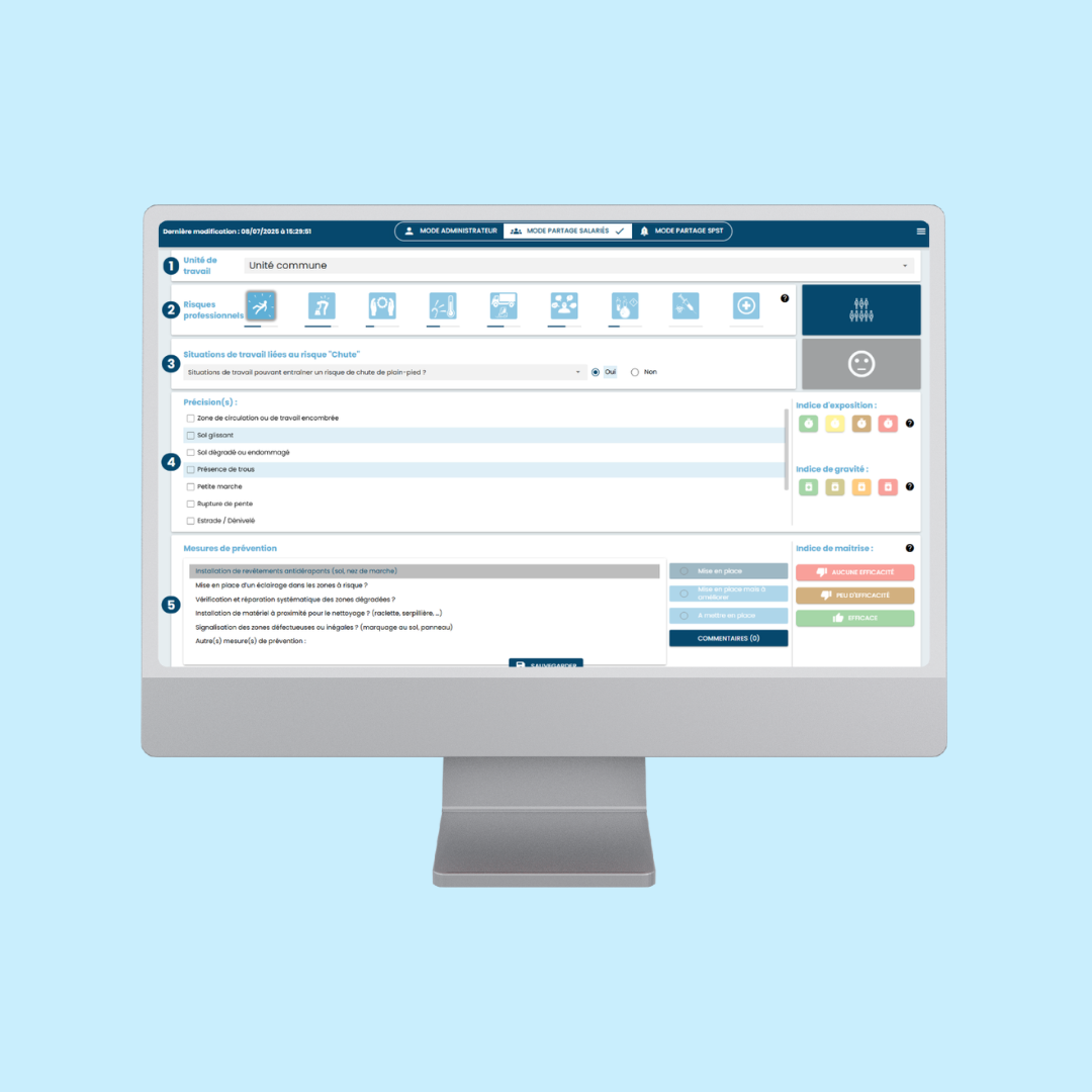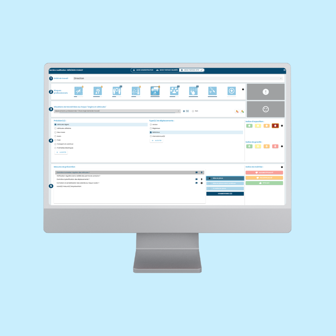 L'adhérent est guidé et bénéficie de conseils en prévention tout au long du remplissage de son état des lieux. Des indicateurs d'avertissement apparaissent au fur et à mesure du remplissage pour renseigner l'adhérent et le SPST sur ses marges de progression.